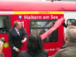 Haltern. Die Stadt Haltern ist Pate eines „richtungsweisenden Verkehrsmittels“ geworden: Bürgermeister Bodo Klimpel hat einen Zug des Typs ET 422 auf den Namen „Haltern am See“ getauft. Der Zug gehört zur S-Bahn Rhein-Ruhr, ein Verkehrsbetrieb der DB Regio NRW. Unter dem Applaus der zahlreichen Gäste ließ der Bürgermeister nach Art einer Schiffstaufe eine Sektflasche am Zug zerschellen. Den ganzen Artikel lesen… »