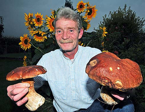 Marl/Haltern (dug) Willi Nienhaus ist Pilzkenner und Glückspilz in einem. Der Elektriker aus Marl-Hüls staunte nicht schlecht, als er beim Spazierengehen in Haltern-Sythen gleich eine ganze Batterie Steinpilze fand. Wo genau will der 54-Jährige nicht verraten, damit niemand in seinem Geheimrevier „wildert“. Doch Nienhaus ist nicht nur ambitionierter Pilzesammler sondern ein besonders erfolgreicher zudem. „Im letzten Jahr hat er mich geradezu mit Pilzen erschlagen,“ freut sich Ehefrau Silvia mit ihrem Mann. Große Augen machte der Marler am Donnerstag, als ihm diese Prachtexemplare vor die Augen kamen. 23 Zentimeter im Durchmesser misst der eine, der andere ist gut 19 Zentimeter groß. Jetzt kommen die Riesendinger in den Heizungskeller zum Trocknen und dann wird aus dem einen eine leckere Soße gemacht, der andere kommt am Sonntag auf den Tisch. „Mit viel Speck,“ freuen sich die Eheleute auf das unverhoffte Festmal. Foto: Grone