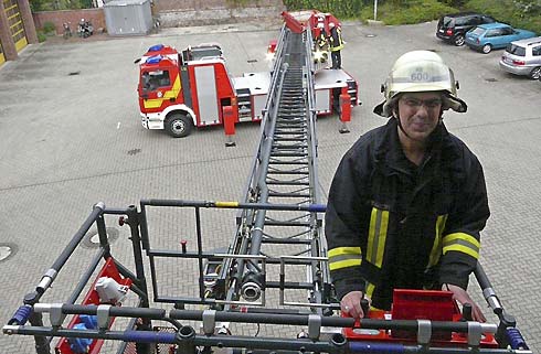 Die hat nun ein brandneues Gefährt. Das glänzt nicht nur mit knallrotem Lack, sondern auch vielen neuen Vorzügen. Auf 32 Meter lässt sich der Leiterpark ausfahren. Der oben befestigte Korb trägt 270 Kilo Gewicht, 90 Kilo mehr als das Vorgänger-Modell. Größer ist er auch und viele einklappbare Gitter sorgen für den komfortablen und schnellen Einstieg. „Das ist absolut wichtig für die Personenrettung“, erklärt Feuerwehrmann Peter Stawitzki, „Zwei Mann stehen mit im Korb und versorgen die Patienten. Auch Tragen können problemlos am Korb befestigt werden.“