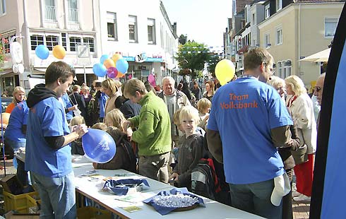 Haltern (rk). Nach der Vertreterversammlung und der Jubiläumsfeier am 21. Juni in der Aula des Schulzentrums zum 125-jährigen Bestehen der Volksbank Haltern eG fand nun im Jubiläumsjahr eine weitere Veranstaltung am Samstag von 9.30 bis 13 Uhr auf dem Marktplatz in Haltern statt. „‚Vor Ort für Sie da’ war das Logo. Damit wollten wir uns für die gute Zusammenarbeit mit den Bürgen in Haltern bedanken und haben gedacht: Gehen wir in die Stadt und machen den Menschen eine Freude“, so Christoph Sebbel, Prokurist und Leiter Marketing der Volksbank.