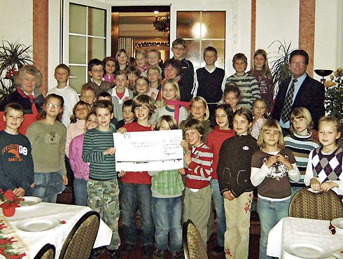 Schermbeck. Anlässlich der Weihnachtsfeier der Leichtathleten des SV Schermbeck überreichte Abteilungsleiter Ulrich Stiemer im Beisein des als Weihnachtsmann verkleideten „Nikolaus“ einen Scheck in Höhe von 250 Euro an Gudrun Gerwien, der Leiterin der Aktion „Gagu Zwergenhilfe“. Hiermit wird Gerwien in ihrer Wette gegen Bürgermeister Grüter unterstützt. Hierbei wettete sie, dass jeder Einwohner Schermbecks zumindest 2 Euro an die Aktion spendet. Das würde ein Spendenaufkommen von 30.000 Euro bedeuten – die bisherige Spendensumme wurde noch nicht verraten.
