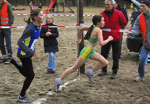 Im Bild der Zieleinlauf der Schülerinnen W12-13 über 1.400 Meter (vorne Sarah Nocke, TLV Germania Überruhr in 6:20 Minuten (2. Platz), vor Inken Terjung (6:21), TSG Dülmen.