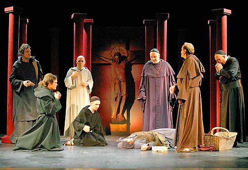 Dorsten (om). Mit der Bühnenfassung von Umberto Ecos Weltbestseller „Der Name der Rose“ wird die Theaterspielzeit des Kulturbüros Dorsten in dieser Saison abgeschlossen. Vera Oelschlegel führt die Regie bei der preisgekrönten und gefeierten Inszenierung des Theaters des Ostens. Der englische Franziskanermönch William von Baskerville besucht im Jahr 1327 mit seinem Schüler Adson von Melk in geheimer Mission eine abgelegene Benediktinerabtei in Norditalien.