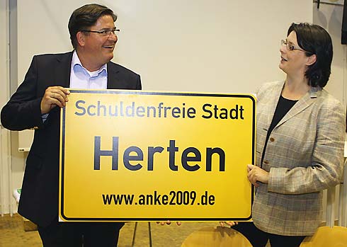 Zum Abschluss überreichte Staehler Anke Flemming zur Motivation für den anstehenden Wahlkampf als Geschenk ein Ortseingangschild mit der Aufschrift: „Schuldenfreie Stadt – Herten“.