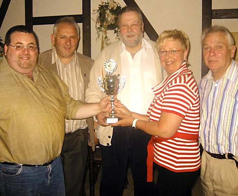 Dorsten. Zum Sessionsabschlusstreffen hat das Festkomitee Dorstener Karneval wieder die teilnehmenden Vereine vom Rosenmontagsumzug eingeladen. Die beiden Vorsitzenden Bodo Kammann und Günter Koytek konnten zahlreiche Teilnehmer sowie das Stadtprinzenpaar Edgar I. und Brigitte I. im Deutschen Eck begrüßen. Dabei wurden auch Pokale für den schönsten Motivwagen sowie die originellste Fußgruppe verliehen. Nach langen Diskussionen hatte man sich auf zwei Teilnehmer geeinigt: Die Wahl fiel auf die Dorstener Altstadtnarren (Motivwagen) und den Reiterverein Gahlen (Fußgruppe). Während die Altstadtnarren ihren Pokal sofort in Empfang nehmen konnten (Foto), waren die Reiter aus Gahlen verhindert. Die Auszeichnung wird nachgeholt.
