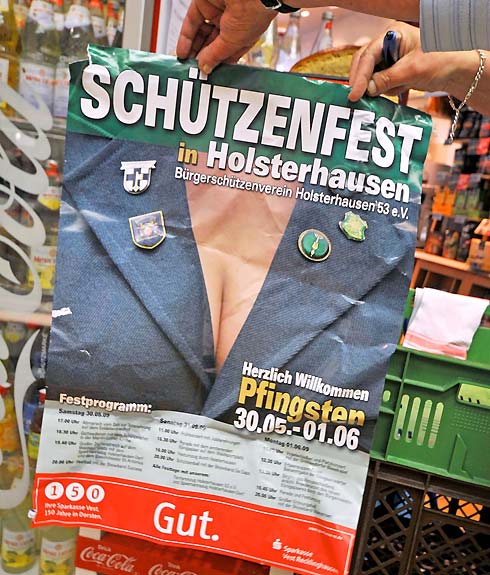 In Dorsten-Holsterhausen hat das Einladungsplakat derart für Furore gesorgt, dass bei Bäcker Nolte, wo die Schützen auch ihren Vogel ausstellten, das Plakat auf Drängen der Kunden wieder aus dem Fenster genommen werden musste.