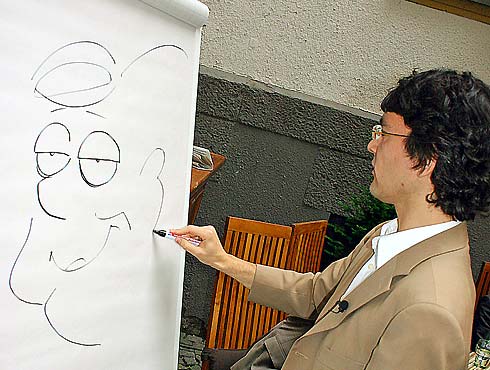 „Angela Merkel habe ich schon 1998 gezeichnet. Da war sie noch Umweltministerin. Was mich an ihr fasziniert hat, sind ihre Kulleraugen.“ Normalerweise startet der Zeichner mit der Nase, doch bei Angie macht er eine Ausnahme. Mit wenigen prägnanten, präzisen Strichen zaubert er bei der Buchpräsentation Stoiber, Schröder und eben Merkel auf die Flip-Chart.