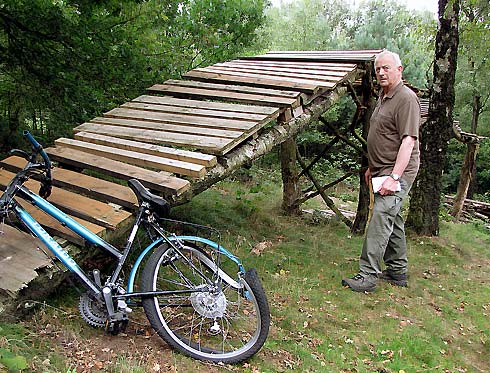 Die etwa 15 bis 20 Meter lange Konstruktion besteht aus Paletten, Brettern und morschen Birkenstämmen, schlecht zusammengehalten von rostigen Nägeln, die an vielen Stellen hervorstehen. Gleich neben diesem wackelingen Bauwerk lag ein völlig zertrümmertes Mountain-Bike.