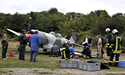 Unvorhergesehener Feuerwehreinsatz: Verunfallter Oldtimer beim Flugtag. Fotos: Bludau