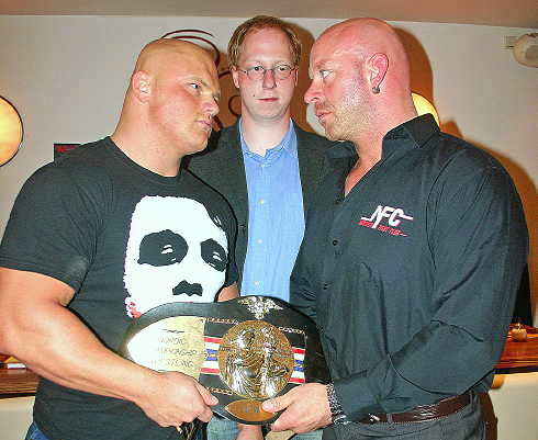 Wrestlinghausen (mc). Der Countdown läuft: Am 10. Oktober treffen Weltmeister Karsten Kretschmer und Bad Bones John Kay aufeinander (Bild). Dann will „Frischling“ John Kay dem alten Hasen Karsten Kretschmer den erst im März gewonnenen Titel in der Vestlandhalle wieder abnehmen. „Wir haben uns entschlossen, den Recklinghäuser Catch Cup als Weltmeisterschaftskampf auszurichten, weil am 29. September die beiden bei der First Impact Tour in den Dortmunder Westfalenhallen aufeinander treffen,“ verrät Mitveranstalter Matthias Ilgen (Bildmitte). „Da haben wir uns gedacht, wir setzen noch einen drauf.“