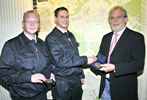 Dorsten (red). Gut einen Monat nach einem dramatischen Einsatz hat Dorstens Bürgermeister Lambert Lütkenhorst zwei freiwillige Feuerwehrleute, stellvertretend für ihre Kollegen, mit dem Stadtsiegel der Stadt ausgezeichnet.