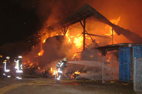 Marl. In der zweiten Nacht in Folge kam es in Marl zu einem Großbrand. Bereits von Freitag auf Samstag brannten rund 350 Strohballen lichterloh an der Altendorfer Strasse. Dann ging das Strohlager und eine Scheune auf dem Reiterhof Rohmann an der Stübbenfeldstrasse in Flammen auf.