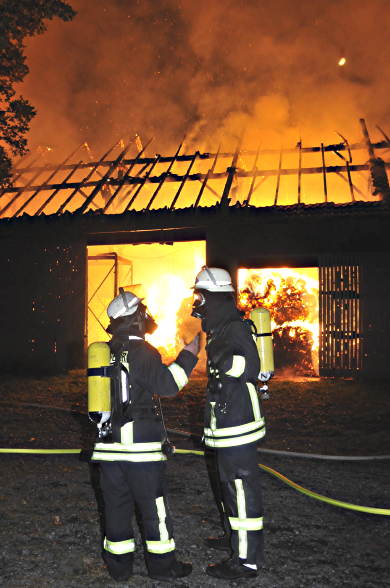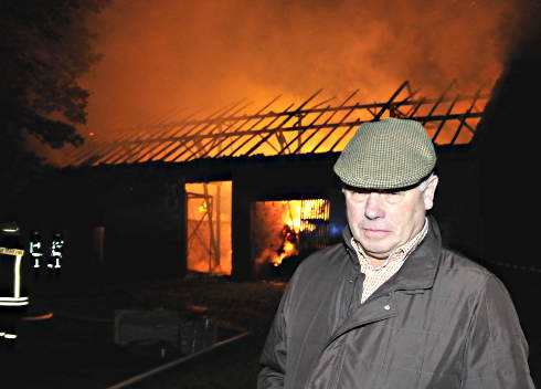 Die Pferde aus den Stallungen in der Scheune konnten durch die offenen Tore noch selbst flüchten. Die Pferde und die Scheune gehören dem Pferdezüchter Georg Ahlmann (Bild ganz oben), der noch in der Nacht an der Einsatzstelle erschien und völlig fassungslos mit ansah, wie die Scheune und das darin gelagerte Stroh abbrannten. Um genügend Löschwasser zu beiden Einsatzstellen zu bekommen, bauten die Feuerwehrmänner eine über hundert Meter lange Schlauchleitung auf.