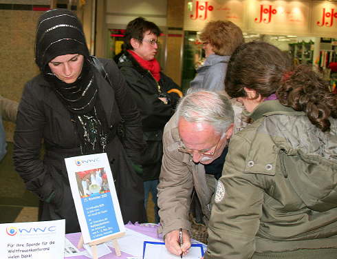 Den internationalen Tag gegen Gewalt an Frauen und Mädchen nahmen von Abschiebung bedrohte Familien zum Anlass, um auf ihre Lage aufmerksam zu machen. Wie die Familie Eke leben zahlreiche Mitbürger in ständiger Angst vor Abschiebung. Bürgermeister Arndt zeigte Verständnis für die Sorgen und Nöte der Familie und sicherte ihnen ein Gespräch im Bürgermeisteramt zu. Denn die libanesische Familie Eke soll bereits in der nächsten Woche in die Türkei abgeschoben werden, obwohl alle vier Kinder hier geboren sind und Gülal Eke schon über 20 Jahre in Deutschland lebt. Zahlreiche Passanten protestierten spontan bei einer Unterschriftensammlung gegen die Abschiebung der Familie.