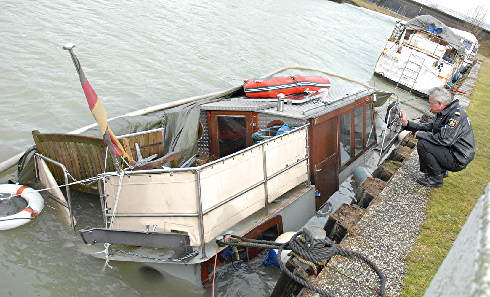 Heute Nachmittag (25.2.) ist eine Motoryacht im Dortmund-Ems-Kanal (Marina Füstrup bei Lüdinghausen) gesunken. Das heute privat genutzte ehemalige Versorgungsschiff der deutschen Kriegsmarine von 1936 war in dem Sportboothafen vor Anker gegangen. Vermutlich durch einen Frostschaden kam es zu einem Wassereinbruch. Die Feuerwehr legte einen Schlengel um das Boot, damit auslaufendes Motoröl nicht in den Kanal gelangen kann. Am frühen Abend soll das Schiff geborgen werden. Foto: Schulmann