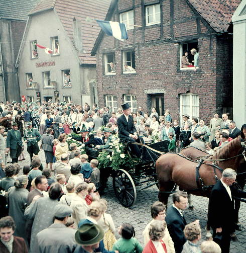Schützenfestumzug zur Miaschanze auf dem Disselhof in den 50er Jahren, im Hintergrund die ehemalige Gaststätte „Zum Unterstand“