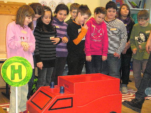 Was alles im Straßenverkehr passieren kann - das haben die meisten Kinder nicht erwartet. Umso eifriger finden sie heraus, wie sie sich richtig an der Bushaltestelle und im Bus selbst verhalten müssen. In spielerischen Situationen testen sie, wo die Gefahren lauern: Da wird ein Teppich zum Bürgersteig, Stühle zu Bussitzen oder Bustüren. Ein Feuerwehrauto aus Plastik simuliert den heranfahrenden Bus und ein selbstgebasteltes Schild markiert die imaginäre Bushaltestelle.