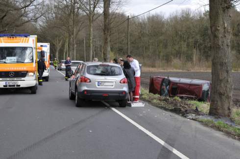 Dosten. Einen Mega-Schutzengel hatte ein 61-Jähriger am Samstagnachmittag. Gegen 15 Uhr befuhr er mit seinem VW Passat Fahrer die Weseler Strasse von Deuten in Fahrtrichtung Wulfen und wollte eine vorausfahrende Fahrzeugkolonne überholen. Als der Dorstener in Höhe der anderen Fahrzeuge war, setzte eine 37-jährige Fahrerin aus Lembruch ebenfalls zum Überholvorgang an. Um einen Zusammenstoss zu vermeiden wich der VW Passat Fahrer aus und verlor dabei die Kontrolle über sein Fahrzeug. Der VW schleuderte über die Fahrstreifen prallte gegen den Wagen eines 41-jährigen Fahrers aus Wesel, streifte einen Alleebaum und überschlug sich auf einem Feld. Der VW Passat kam auf der Seite liegend zum Stillstand, so dass der Fahrer sich nicht mehr alleine befreien konnte. Die anderen Unfallbeteiligten eilten zum verunfallten Pkw und halfen dem verletzten Dorstener aus seinem Fahrzeug. Die alarmierte Feuerwehr und der Rettungsdienst versorgten den Mann vor Ort und sicherten die Einsatzstelle ab. Der anwesende Notarzt stellte nur leichte Verletzungen fest, so dass der Mann vor Ort bleiben konnte. Die Polizei sperrte einen Fahrstreifen und nahm den Unfall auf.
