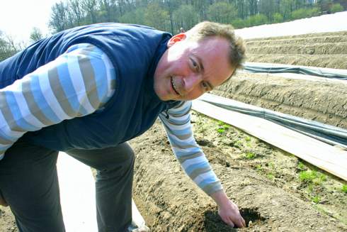 Vest. Wenn Heiner Schulte-Scherlebeck in der Hertener Ried über seine Felder läuft, strahlt er mit der Sonne um die Wette. Überall ragen sich ihm kleine weiße Köpfchen entgegen - die Spargelzeit hat begonnen. „Bald ist es soviel, dass es auf den Feldern aussieht als hätte es geschneit“; weiß der Experte. Noch allerdings muss der Spargelhof Schulte-Scherlebeck Vorbestellungen entgegen nehmen. „Wir könnten dreimal soviel Spargel verkaufen, nur soviel ist es derzeit noch nicht.“ Dass bereits geerntet werden kann, liegt an der besonderen Anbauweise. Die sandigen Hügel sind mit einer dunklen Folie abgedeckt über die eine weiße Folie gelegt wird. Das speichert die Sonnenwärme und die Stangen können sich entwickeln. Sieben Arbeiter bringen derzeit das kostbare Gemüse in die Körbe und das ist Knochenarbeit. In gebückter Haltung stehen sie vor den niedrigen Hügeln, graben mit der Hand die Stange aus und mit einem Spargelstecher wird gestochen. Anschließend muss das kleine Loch wieder zugeschüttet werden. „Mit geübten Augen sieht man auch anhand der Risse im Boden, wo sich der Spargel entwickelt“, grinst der Spargelbauer und stellt seine Bemerkung sofort unter Beweis. In der Hochsaison beschäftigt Schulte-Scherlebeck übrigens 20 Arbeiter, die das Königsgemüse zum Verbraucher bringen.