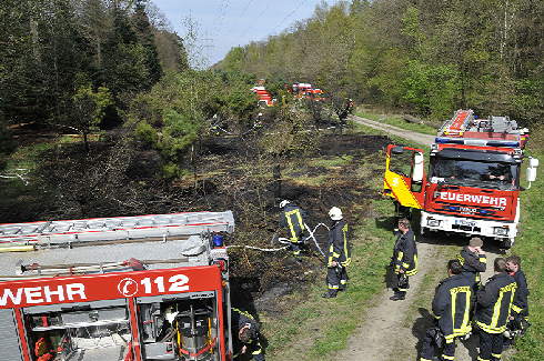 Dorsten. Herrliches Wetter, die Sonne scheint und schon musste die Feuerwehr zu den ersten Waldbränden ausrücken. Am Samstagnachmittag wurde die Dorstener Feuerwehr mit insgesamt vier Löschzügen zu einem Waldstück in Lembeck gerufen. Hier waren aus bislang unbekannten Gründen rund 500 Quadratmeter in Brand geraten. Mit Wasser aus mehreren C Strahlrohren wurde das Feuer bekämpft und abgelöscht.