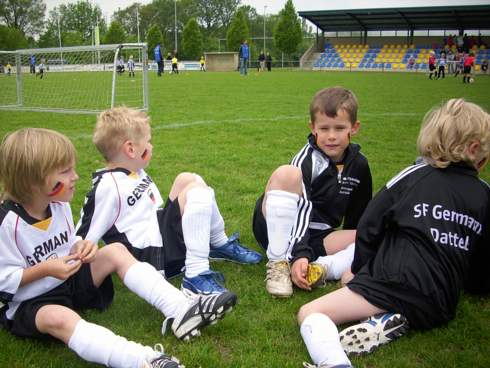 Datteln. Am Wochenende fuhren die G-Junioren der SF Germania Datteln zum ersten Mal für ein Zeltwochenende nach Lochem in den Niederlanden. Nach einer etwas kalten Nacht stand am Sonntag ein vom Sportclub Lochem organisiertes Minikickerturnier auf dem Programm. Um 10 Uhr versammelten sich insgesamt 20 Mannschaften auf dem Hauptplatz des Sportclubs. Die Minikicker in den Niederlanden spielen allerdings nicht sieben gegen sieben, sondern vier gegen vier ohne Torwart. Insgesamt stellten die Dattelner drei Mannschaften, die auf die fünf Gruppen aufgeteilt wurden. Da für alle Kinder Deutschlandtrikots organisiert worden waren, konnten die Germanen-Minis während des Turniers als "Team Deutschland" auflaufen. Die G1 gewann alle ihre Spiele und wurde in ihrer Gruppe Turniersieger, die G2 dagegen gewann ein Spiel, trennte sich einmal unentschieden und verlor zwei Spiele. Ein Unentschieden und drei Niederlagen musste die G3 hinnehmen. Unabhängig von den Ergebnissen hatten aber sowohl die Kinder als auch die mitgereisten Eltern ihren Spaß. „Wir danken den Holländern für diese zwei wirklich schönen Tage und wir würden uns freuen, wenn wir nächstes Jahr die Fahrt wiederholen könnten“, äußerte sich der begeisterte G-Junioren-Trainer Stefan Gerwerth.