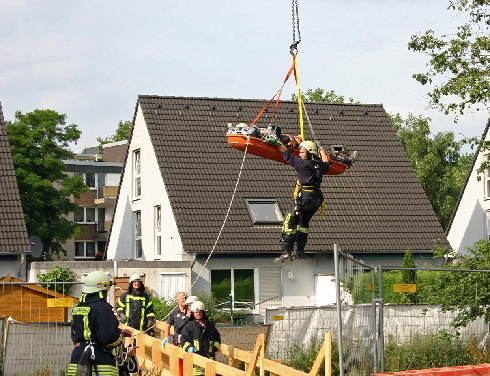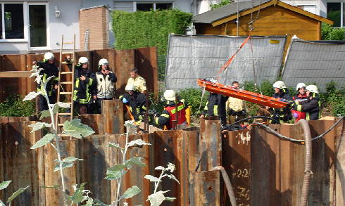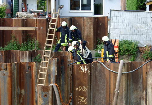 Recklinghausen. Die Breuskesbachsiedlung wurde heute Nachmittag aus ihrer sommerlichen Idylle gerissen. Gegen 16.50 Uhr fuhren mehrere Löschzüge auf ein Firmengelände an der Friedrich-Ebert-Straße. Ein Arbeiter war in der Baugrube von einem herabstürzenden Metallteil getroffen und schwer verletzt worden.