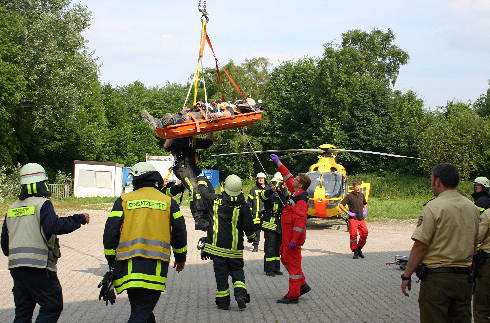Die mit einem Großaufgebot herbeigeeilten Rettungskräfte griffen auf den Kran der beteiligten Baufirma zurück um den Verunglückten mit der Rettungswanne zu bergen. Bereits in der Baugrube wurde der Arbeiter notärztlich versorgt und künstlich beatmet. Nachdem er an die Oberfläche gehoben worden war, wurde der Mann im Rettungswagen stabilisiert und für den Lufttransport vorbereitet. Der herbeigerufene Rettungshubschrauber brachte den Arbeiter dann ins Krankenhaus. Die Ermittlungen zur Unfallursache laufen noch.