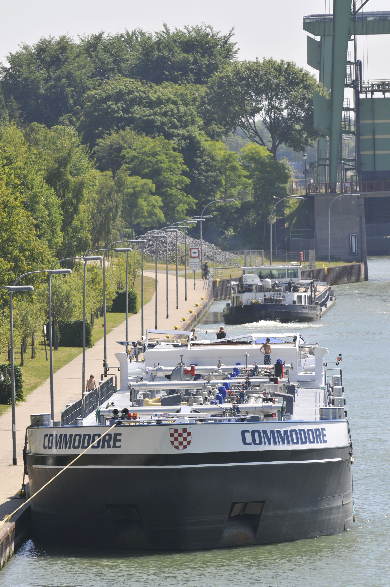 Plötzlich stand der Schiffsführer im Freien. Bei der Einfahrt in die große Kammer der Schleuse Do…