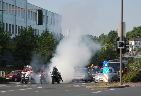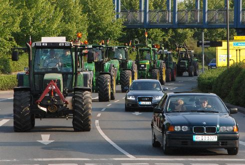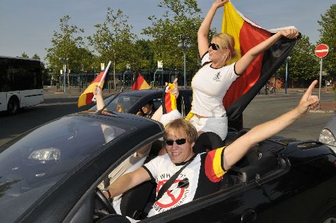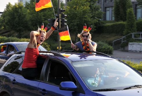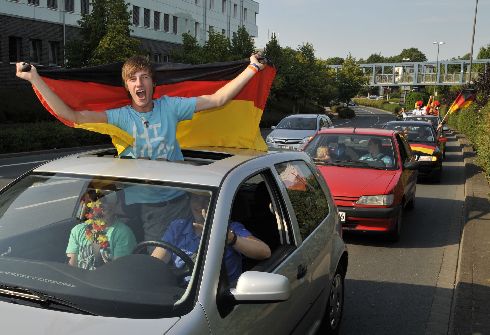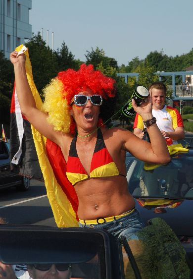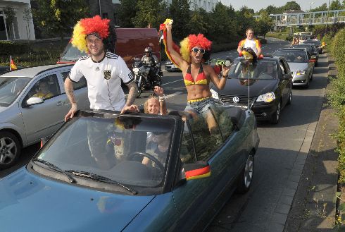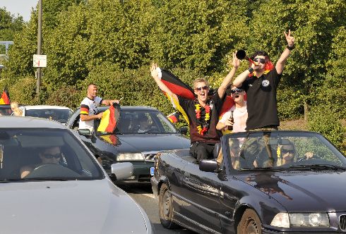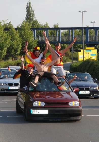Dorsten. Nach dem Sieg der Deutschen Fußballnationalmannschaft gegen England feierten hunderte begeisterte Fans in Dorsten. Viele Pkw sind extra geschmückt worden und ihre Fahrer und Beifahrer starteten nach dem Spiel einen Autokorso durch die Dorstener Innenstadt. Der Korso verlief unfallfrei und dauerte mehrere Stunden. Kurzentschlossen verabredeten sich auch mehrere Bauern aus der Dorstener Umgebung den Einzug ins Viertelfinale mit einem Treckerkorso zu feiern. Gegen 19.00 Uhr fuhr eine Kolonne von sieben Treckern durch die Strassen der Dorstener Innenstadt. Auf einem Platz am Busbahnhof machten die Landwirte kurz Rast, bevor sie sich noch einmal zu einer weiteren Runde über die Bundesstrasse 224 in Richtung Holsterhausen aufmachten. Der Korso wurde von Hunderten feiernden Passanten vom Straßenrand bejubelt.