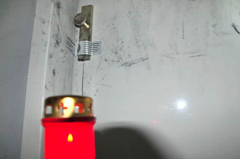 Vor der versiegelten Wohnung im Dachgeschoss haben Nachbarn eine Kerze aufgestellt.