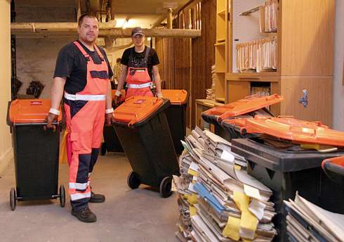 In den letzten Wochen haben schon viele Bereiche kräftig "ausgemistet". Einige Dinge nehmen die Mitarbeiter des Stadtarchivs in ihre Obhut, der Rest wandert in den Müll. Dafür stellte der ZBH zunächst 100 Mülltonnen à 120 Liter, also insgesamt 12.000 Liter zur Verfügung.