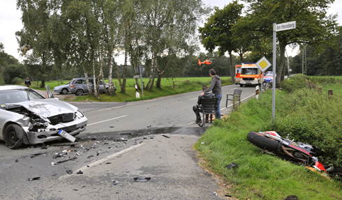 Gegen 15.10 Uhr wollte eine 72-jährige Mercedes-Fahrerin den Parkplatz eines Restaurants verlassen und auf die Rekener Straße abbiegen, sie übersah zwei Biker. Einer der Kradfahrer (45), kam trotz Vollbremsung nicht mehr rechtzeitig zum Stehen und knallte in den vorderen seitlichen Bereich des Pkw. Das Motorrad wurde in den angrenzenden Graben geschleudert. Der Motorradfahrer flog über das Fahrzeug und landete nach 30 Meter schwerstverletzt ebenfalls im Straßengraben. Sein Begleiter erlitt einen Schock.