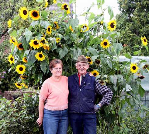Herten. Im Sonnenblumenbeet ragen die leuchtend gelben Blüten weit über die Köpfe der Hobbygärtner hinaus. Dicke orangefarbene Kürbisse scheinen durch das Grün. Violette Beeren warten auf die Ernte: Auch im Spätsommer ist der Garten der Kahlerts im Freiwiese-Grabeland prächtig anzusehen.