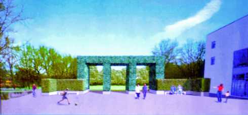 Geprägt wird die Neugestaltung von einem neun Meter breiten und 4,50 Meter hohen „Dimker Tor“ (das an das Brandenburger Tor erinnert). Eine Gitterrahmen-Konstruktion, die mit Steinen gefüllt wird und als Rankhilfe für Grün dient.