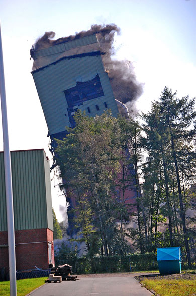 Dorsten(hn). Punkt 14 Uhr war es am Mittwochnachmittag soweit. Auf dem Gelände der ehemaligen Zeche Fürst Leopold wurde der Turm der Kohlenwäsche gesprengt. Rund 120 Kilogramm Sprengstoff waren nötig, um das 1.800 Tonnen schwere Gebäude zu Fall zu bringen. Zahlreiche Schaulustige verfolgten das Spektakel. Da das Gelände weit genug von öffentlichen Flächen entfernt war, mußten keine Straßensperren erfolgen. Auf dem Areal sollen demnächst Geschäfte und Freizeitangebote entstehen.