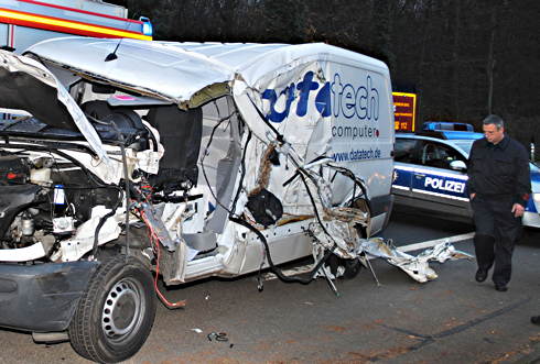Marl. Eine 53-jährige Marlerin geriet heute Morgen mit einem Mercedes Sprinter auf der Recklinghäuser Straße (B225) in den Gegenverkehr und kollidierte mit einem LKW. Die Fahrzeugführerin erlitt schwerste Verletzungen.
