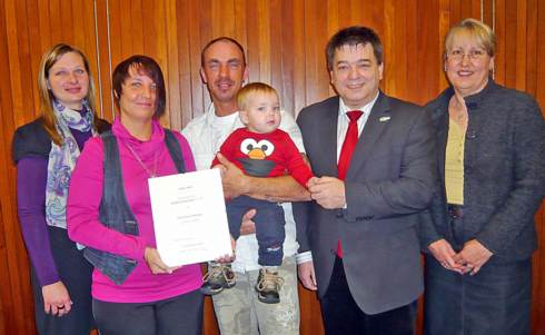 Im Namen von Bundespräsident Christian Wulff überreichte Bürgermeister Werner Arndt (2.v.r.) die Patenschaftsurkunde für Marlon an Ramona und Thorsten Sahlmann. Mit den Eltern freuen sich Andrea Pinkert (l.) und Dorothea Stotten (r.) vom Jugendamt über die Ehrenpatenschaft.