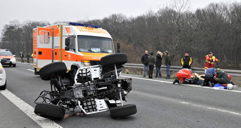 Der Unfall ereignete sich am Samstagmittag auf der L 608, dem Zubringer zur A52. Der 24-Jährige war in Fahrtrichtung Dorsten unterwegs. Etwa 1.000 Meter nach der Ausfahrt der Autobahn kam ihm im Gegenverkehr plötzlich der Quad-Fahrer entgegen. Es kam zum Frontalzusammenstoß der beiden Fahrzeuge. Der Gelsenkirchener Quad-Fahrer, der mit einem Überführungskennzeichen unterwegs war, wurde aus dem Fahrzeug geschleudert und schwer verletzt.