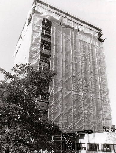 Das Marler Rathaus, Anfang der 1980er Jahre, eingepackt zur Sanierung wie von Christo.