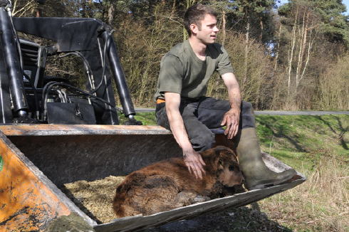 Daraufhin wurde Landwirt Theo Aldenhoff verständigt, der sich der Sache annahm. Mit einem Tecker wurde das Kalb zum Futterplatz der Herde gefahren. Doch zunächst gab es noch eine Ohrmarke für das Neugeborene.
