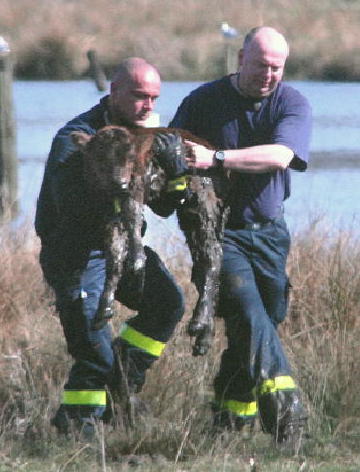 Dorsten. Spektakuläre Rettung eines kleinen Kalbes am Nachmittag in Dorsten. Das junge Tier hatte sich in einem Sumpfgebiet des Naturschutzgebietes Hervester Bruch verirrt und war schon bis zur Brust im Morast versunken.