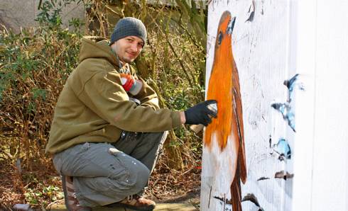 Bewaffnet mit Atemschutzmaske und jeder Menge Spraydosen macht er im Moment Station am Eschenweg. Auf die Trafostation an der Ecke Uferstraße bringt er unter anderem ein überlebensgroßes Rotkehlchen auf. Dieses ist Teil einer Naturszene rund um den benachbarten Backumer Bach.