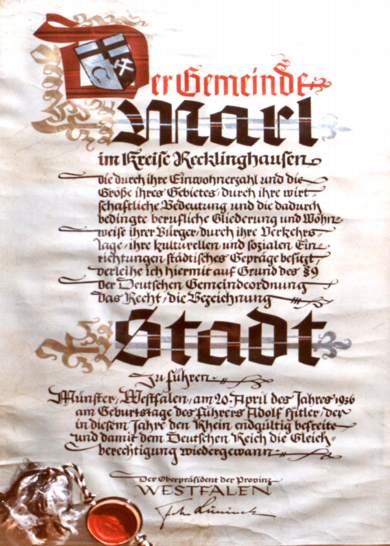 Marl. Es war eine Woche nach Ostern und noch nie habe Marl so schön ausgesehen wie an diesem Tag, hieß es in den Zeitungen: Vor 75 Jahren, am 20. April 1936 erhielt Marl die Stadtrechte verliehen. Der Jubel im neuen „Stadtrat“ war so groß, dass spontan Adolf Hitler (der an diesem Tag 47 wurde) die Ehrenbürgerschaft Marls angetragen wurde.
