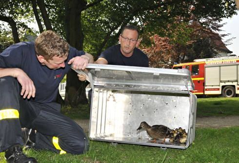Die um Hilfe gebetene Feuerwehr rückte an und fing die gesamte Familie kurzerhand ein. In einer großen Metallbox ging es dann zum nahe gelegenen Schölzbach. Hier konnten die Feuerwehrmänner beruhigt die Entenfamilie in die Freiheit entlassen.