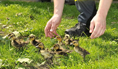 Nachdem der Deckel der Box geöffnet wurde, gab es für die Mutter kein Halten mehr. Nur der Nachwuchs traute sich noch nicht so ganz. Feuerwehrmann Dirk Heppner musste ein wenig nachhelfen. Als die Box vorsichtig angehoben wurde, blieben die Entenküken zunächst im Gras sitzen. Erst als der Feuerwehrmann ihnen den richtigen Weg in Richtung Entenmama zeigte, kam es zur freudigen Familienzusammenführung. Gemeinsam ging es dann ab aufs Gewässer. Ein kühles Bad tat dem Federvieh sichtlich gut.