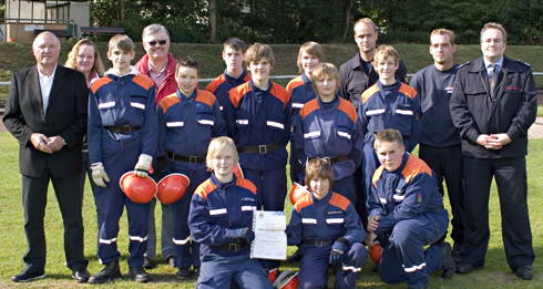 Oer-Erkenschwicks stellvertretender Bürgermeister Herbert Hamann, der Leiter der Feuerwehr, Stadtbrandinspektor Marc Hübner, sowie Fachbereichsleiter Michael Grzeskowiak gratulierten den Jugendlichen und ihren Betreuern zu den guten Leistungen.