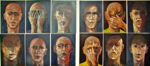 „Diese sind mit dem Pinsel entstanden. Es sind Öl- oder Acrylbilder oder gemischte“, so der 74-Jährige, der von 1960 bis 1997 Lehrer an der Hauptschule in Haltern war und insbesondere Kunst, Deutsch, Englisch und Erdkunde unterrichtet hatte. Daneben sind noch vier Skulpturen unter dem Titel „Kopfgeburt“ zu sehen. „Sie passten ganz gut zu den Köpfen. Ich habe sie vor rund 20 Jahren aus weißglasiertem Ton erstellt.“