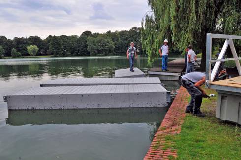 Dorsten. Das Holz war glitschig und morsch, Planken waren durchgebrochen und deshalb musste der Holzsteg am Rande des Barkenberger Sees abgerissen werden. Jetzt bekommt er Ersatz: Acht Beton-ummantelte Styropor-Elemente wurden in dieser Woche zu einem 45 Meter langen Steg montiert und an der Südseite des 1970 künstlich angelegten Sees befestigt. Foto: Bludau