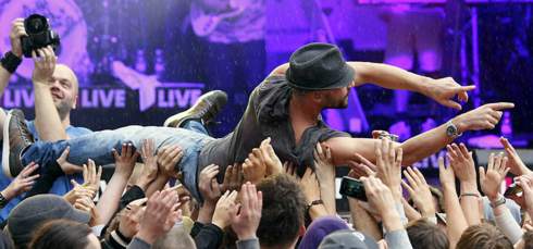 Zwischen Finnland und Italien liegt Dorsten: Jedenfalls für den deutschen Reggae-Star Gentleman, der in dieser Woche auf der Wiese des Paul-Spiegel-Berufskollegs auftrat. Die Dorstener Schule hatte das 1Live-Schulduell gewonnen. Deshalb die Zwischenstation des Künstlers zwischen Finnland und Italien. Der 37-Jährige begeisterte fast 2000 Zuhörer, die mitgingen, sich als textsicher erwiesen und nach einer Stunde energisch Zugaben verlangten – und bekamen. Erst ein kräftiger Regenguss kühlte die Begeisterung ab. Foto: Jens Becker /1 Live