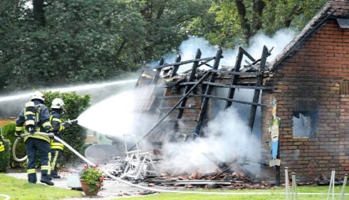 Trotz Sofortangriffs durch die Feuerwehr konnte das völlige Ausbrennen nicht mehr verhindert werden. Direkt neben dem Gebäude stand noch ein zu 30 Prozent gefüllter Flüssiggastank, der gekühlt werden musste. Foto: Schulmann